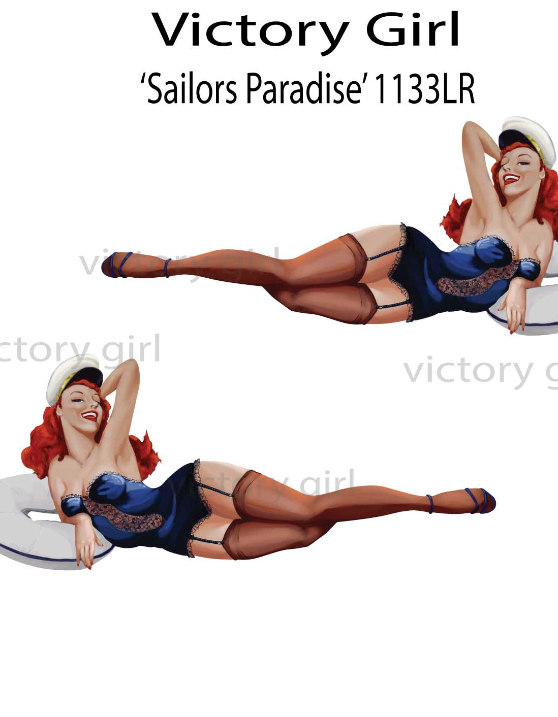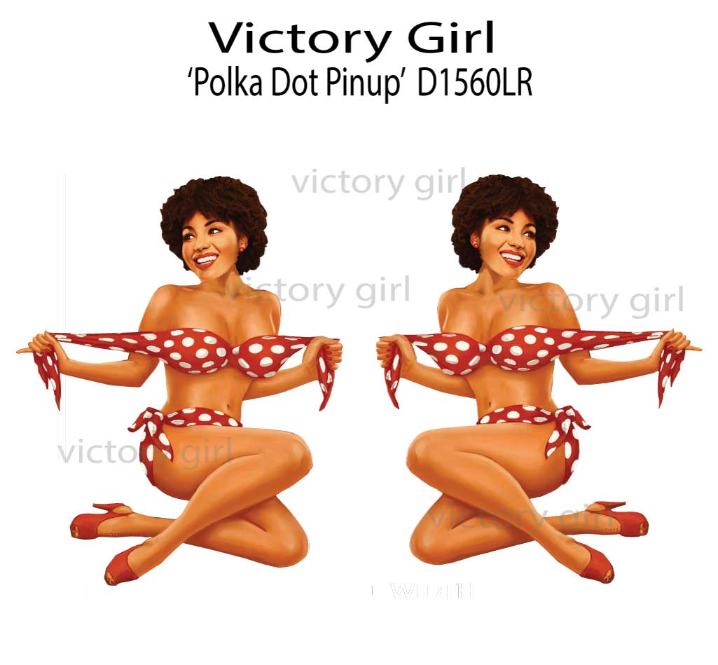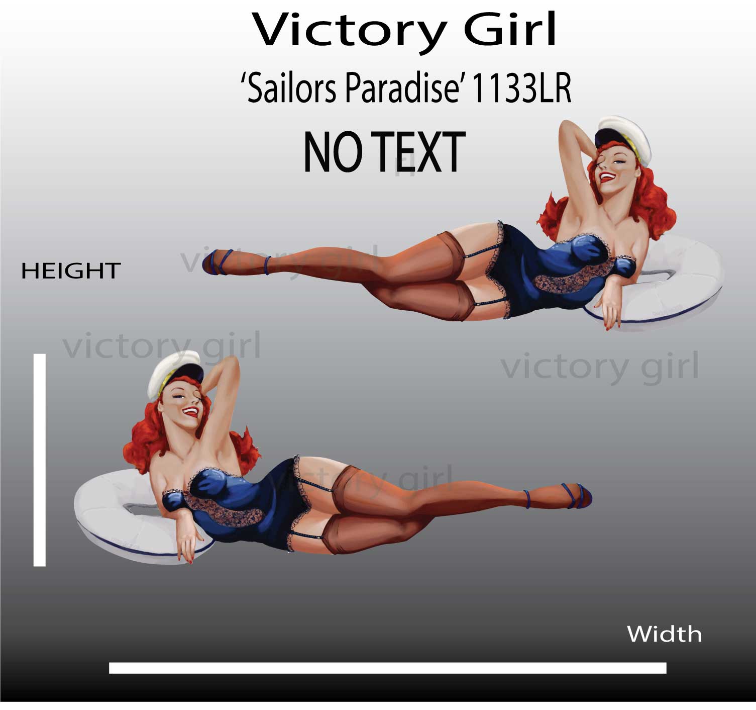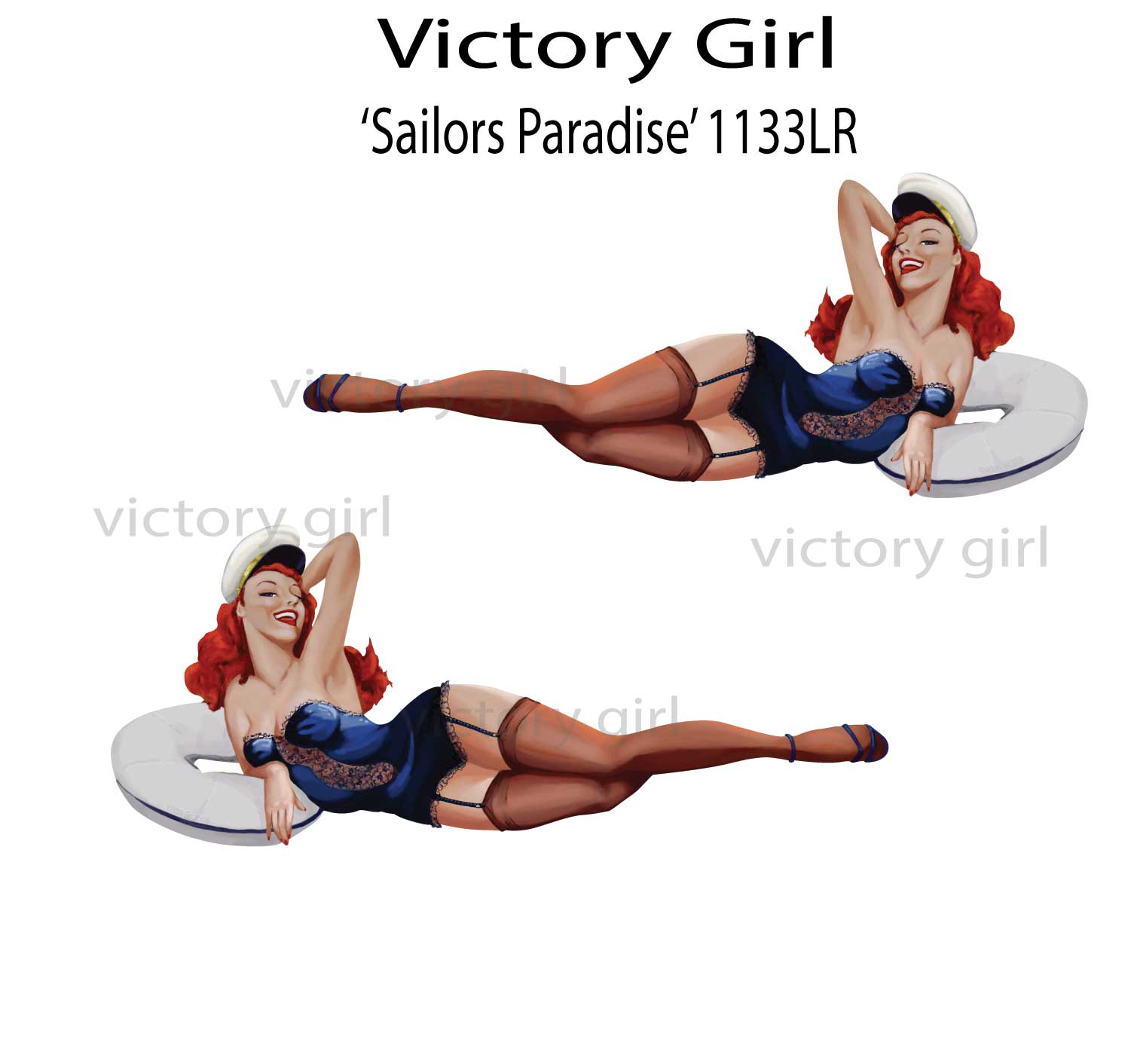 Victory Girl nose art designs are available as contour-cut vinyls! We print our designs on high performance, marine-grade laminated vinyl, suitable for use on exterior surfaces such a boats, aircraft, RVs and vehicles. We work closely with our partner printer to give you high performance vinyl designs at a reasonable price! We do cut custom sizes! Contact us for your specific needs!
