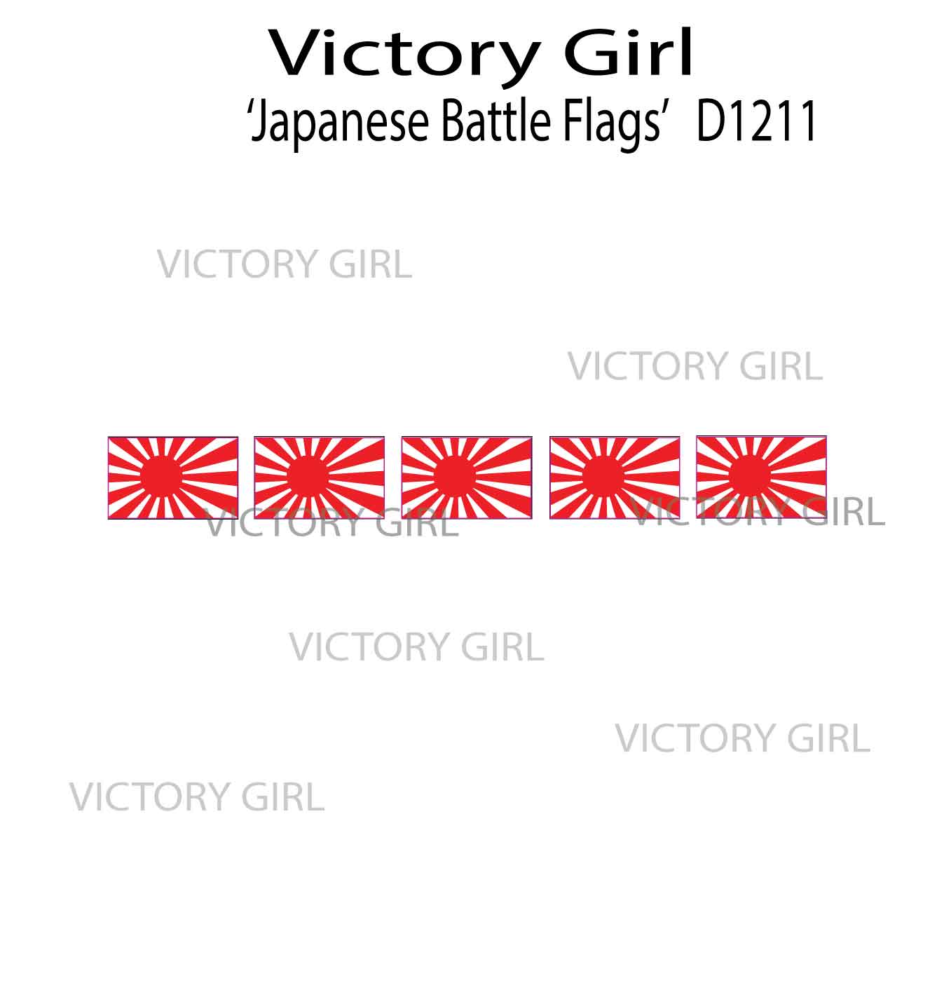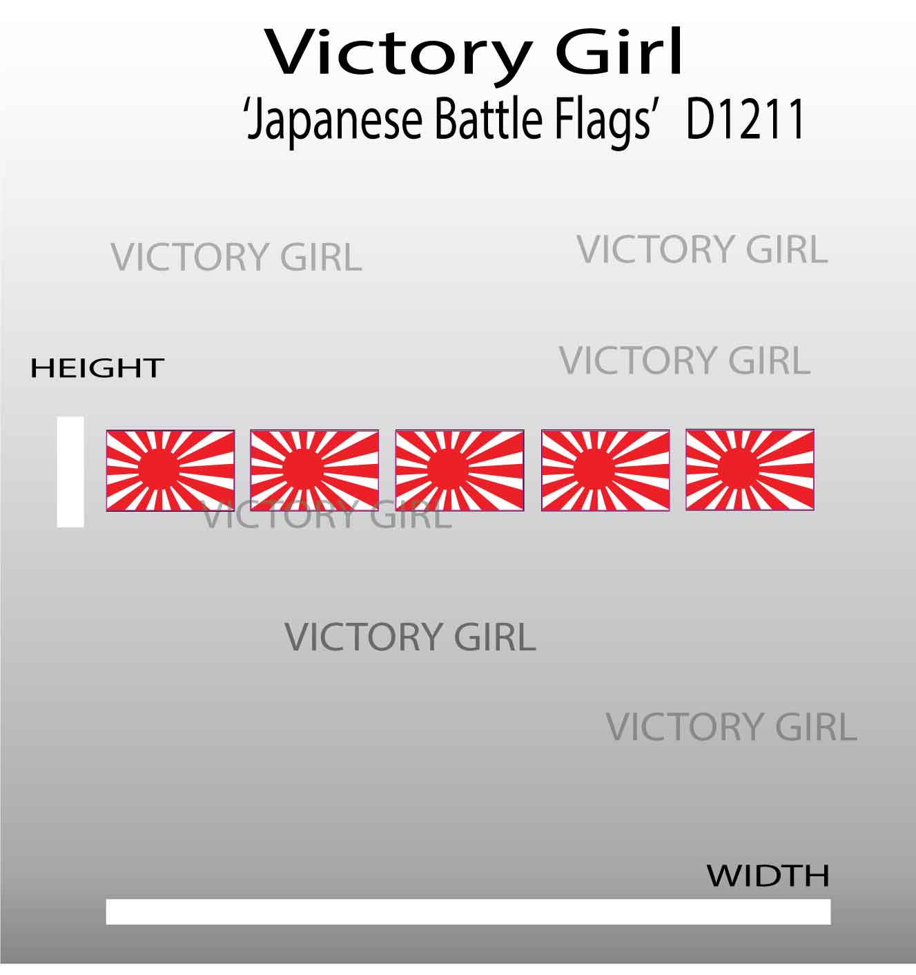 Japanese Battle Flag. The national insignia of the 'Land of the Rising Sun', used during WWII as victory 'mission marks' on Allied aircraft. Design sold in sets of five flags. Sold by total width dimension of 6", 8" and 10". Custom sizes are available, contact us to discuss your special order. Product number D1211.