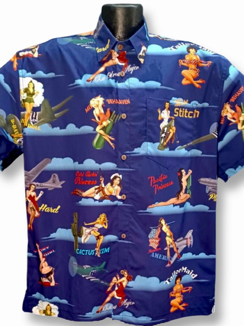 Victory Girl specializes in creating custom nose art, to leather, metal and now, 100% premium cotton hawaiian shirts! Victory Girl can provide A-2 and G-1 style flight jackets, and proudly offers a premium nose art Hawaiian shirt, featuring designs created and/or updated by Victory Girl.