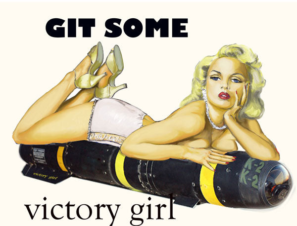 Git Some. A retro burlesque pose, comfortably posed on a modern missile. Sized by longest (width) dimension of 4", 6", 8" and 10" . Printed to sturdy high performance marine grade vinyl material! Custom sizes are available, contact us to discuss your special order. Product number D1984B.