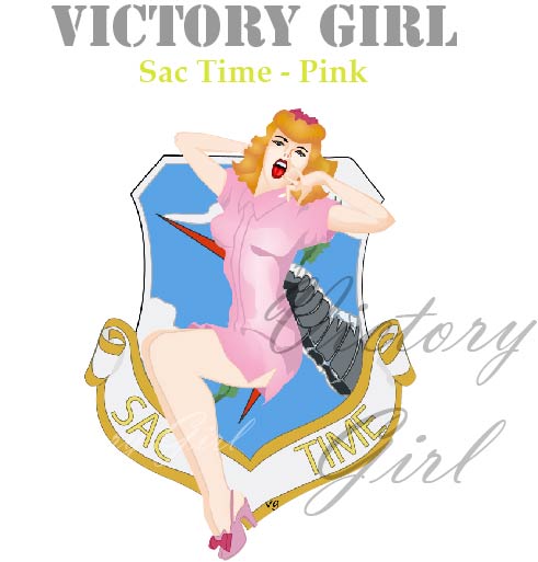 Sac Time Nose Art - Pink. Nose Art featuring a Varga pinup, and referring to 'Strategic Air Command (SAC). Decal length varies by longest dimension of 4", 6", 8". Also available with black dress. Printed on high performance marine grade vinyl material! Custom sizes are available, contact us to discuss your special order. Product number D1131.