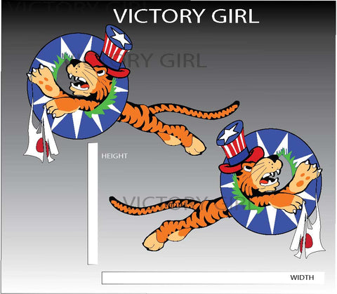 23rd Fighter Group AVG Tiger. The iconic AVG Tiger of the WWII American Volunteer Group,  American pilots who volunteered to fly P40 Warhawks with the Chinese against the invading Japanese, updated for the 23rd FG.  Decal length varies by longest dimension of 3", 4", 6", 8". Now have your own set. Available in high performance marine grade vinyl material! Custom sizes are available, contact us to discuss your special order. Product number D1478LR.